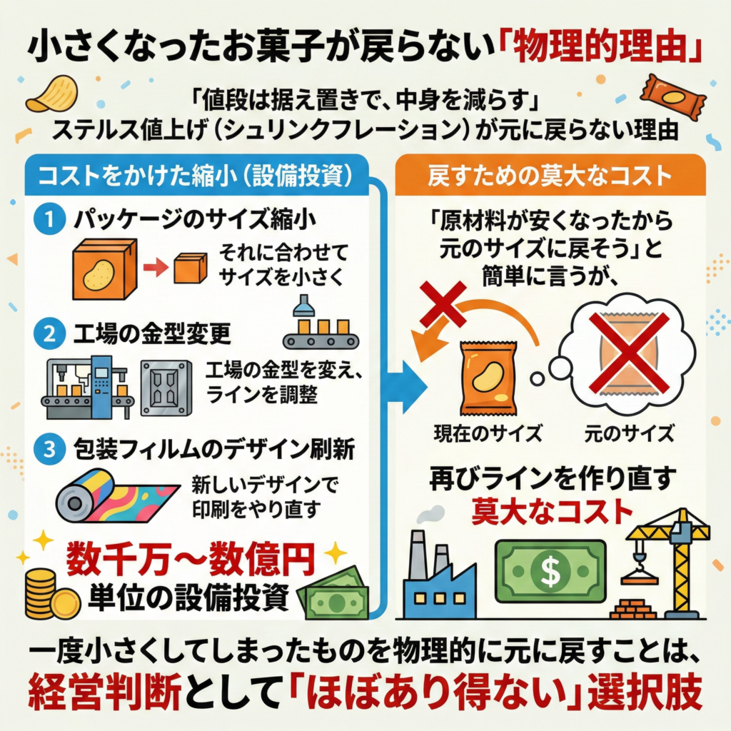 - 「原材料が安くなったから元のサイズに戻そう」と簡単に言うが、それを実行するには再びラインを作り直す莫大なコストがかかる。