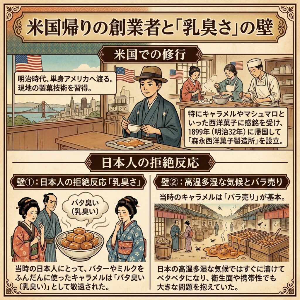 日本のキャラメルの歴史は、森永製菓の創業者・森永太一郎(もりなが たいちろう)の挑戦から始まる。