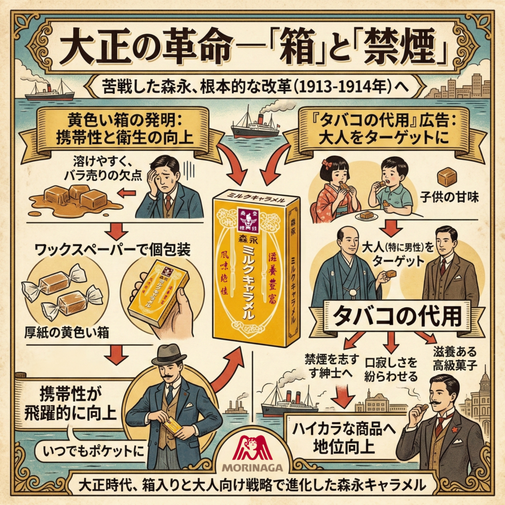 - 「禁煙を志す紳士の口寂しさを紛らわせるための、滋養ある高級菓子」。このブランディングにより、キャラメルは単なる子供の甘味から、大人が嗜むハイカラな商品へと地位を向上させたのである。