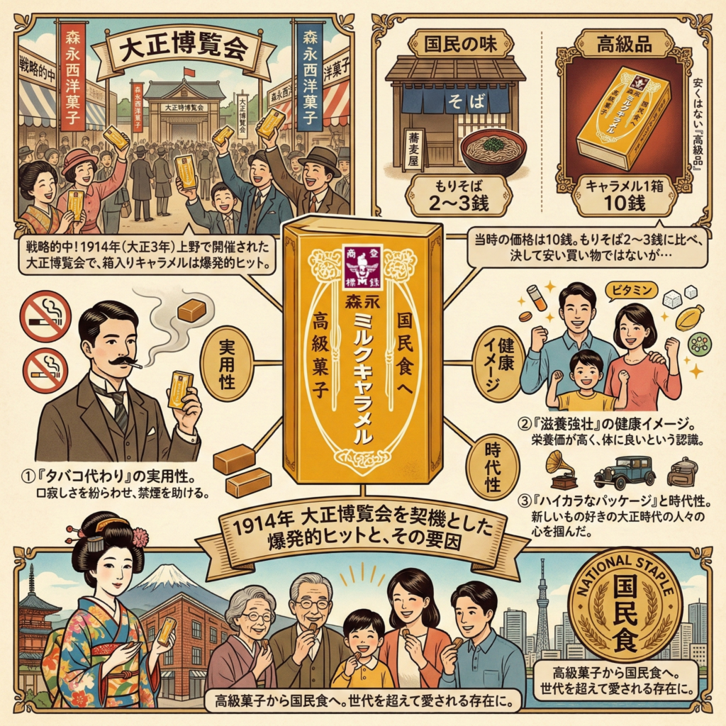 1914年(大正3年)に上野で開催された大正博覧会で、この箱入りキャラメルは爆発的なヒットを記録する。