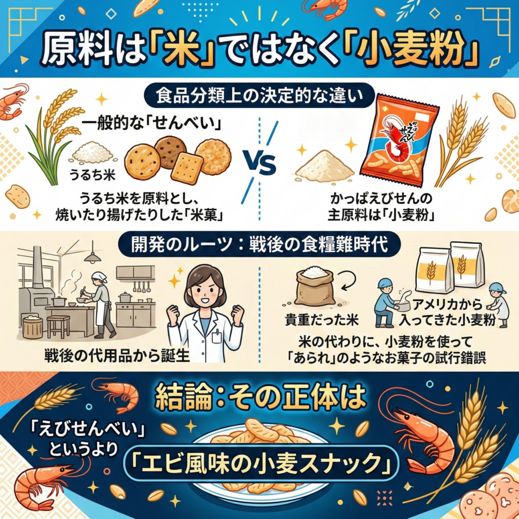 - つまり、その正体は「えびせんべい」というより、「エビ風味の小麦スナック」と呼ぶのが正確なのである。