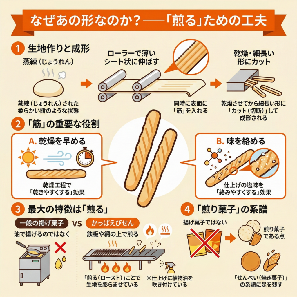 かっぱえびせん最大の特徴である「ギザギザの入った棒状」の形。これはデザインではなく、製造工程における機能的な理由から生まれたものだ。