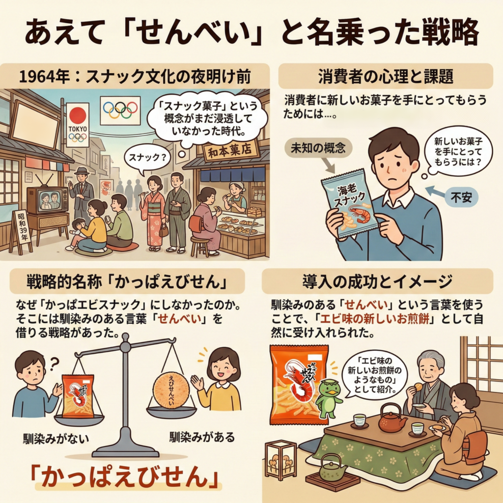 - 消費者に新しいお菓子を手に取ってもらうためには、馴染みのある「せんべい」という言葉を借りて、「エビ味の新しいお煎餅のようなもの」として紹介する必要があったのだ。