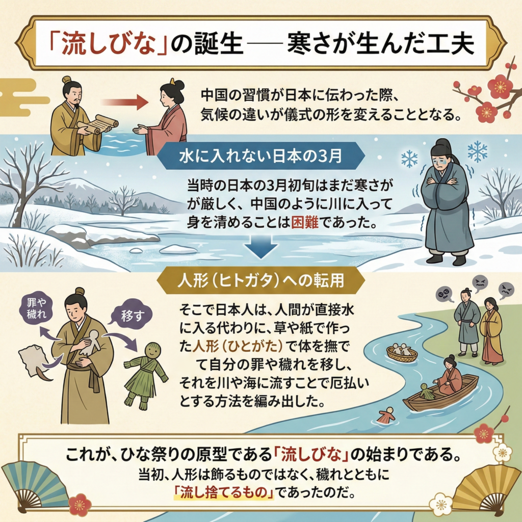 - これが、ひな祭りの原型である「流しびな」の始まりである。当初、人形は飾るものではなく、穢れとともに「流し捨てるもの」であったのだ。