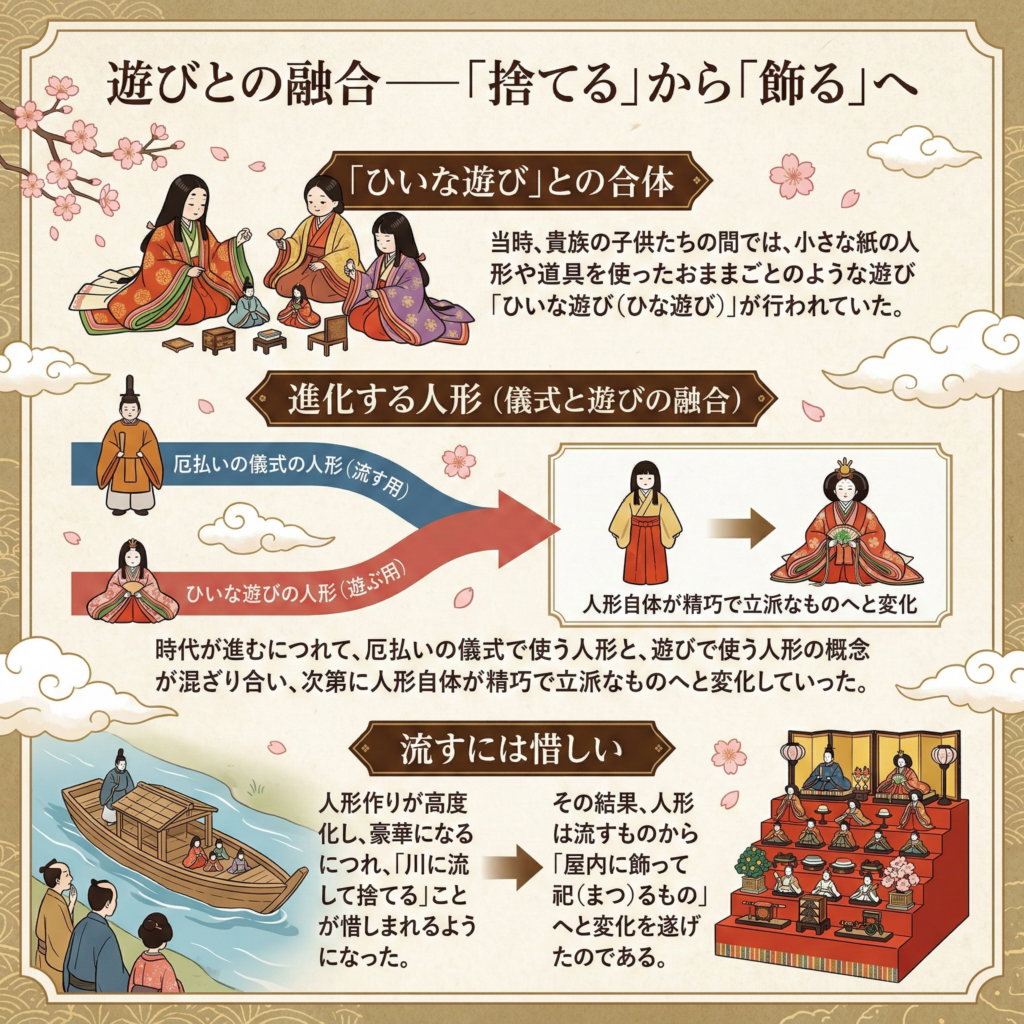 平安時代頃になると、この宗教的な儀式が、宮中の幼い女の子たちの間で流行していた遊びと結びつく。