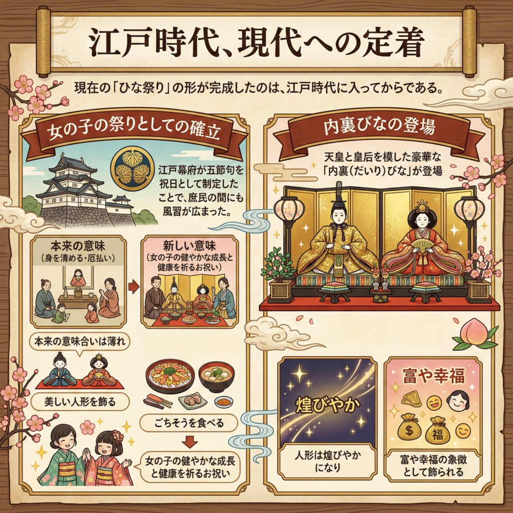 - この頃には、本来の「身を清める(厄払い)」という意味合いは薄れ、美しい人形を飾り、ごちそうを食べて「女の子の健やかな成長と健康を祈るお祝い」という性格が強くなった。