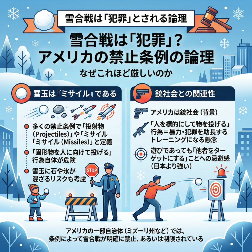 アメリカの一部自治体(ミズーリ州など)では、条例によって雪合戦が明確に禁止、あるいは制限されているケースがある。なぜこれほど厳しいのか。