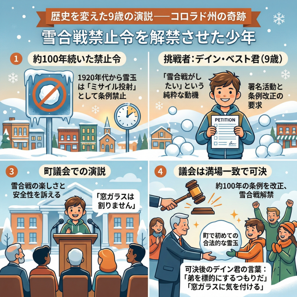 - これに対し、当時9歳のデイン・ベスト君は「雪合戦がしたい」という純粋な動機から、条例改正を求める署名活動を行い、町議会での演説に臨んだ。