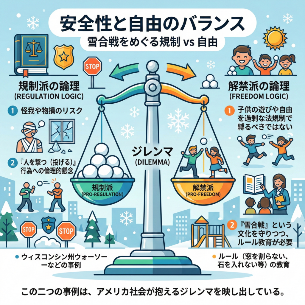- 子供の遊びや自由を過剰な法規制で縛るべきではない。「雪合戦」という文化を守りつつ、ルール(窓を割らない、石を入れない等)を守らせる教育こそが必要であるという考え方だ。