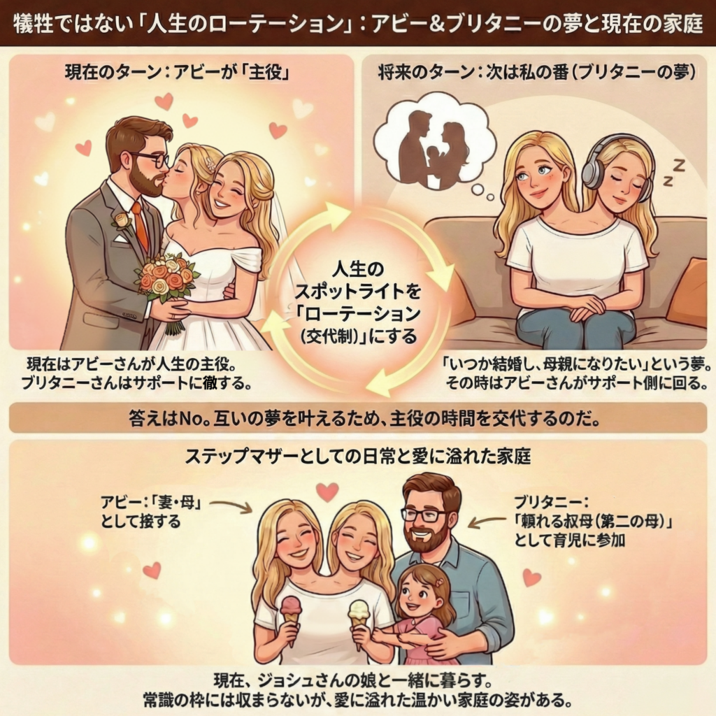 - 現在はアビーさんが人生の「主役」となるターンだが、将来ブリタニーさんにパートナーが現れれば、今度はアビーさんが「気配を消してサポートする側」に回るだろう。