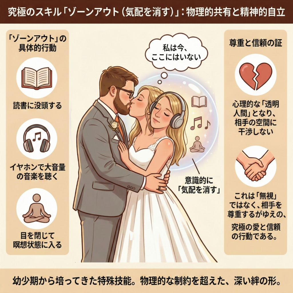 24時間365日、肉体を共有する彼女たちに「物理的なプライバシー」は存在しない。しかし、彼女たちは長年の経験により、物理的距離を超越した「心理的な壁」を作る高度なスキルを習得していた。