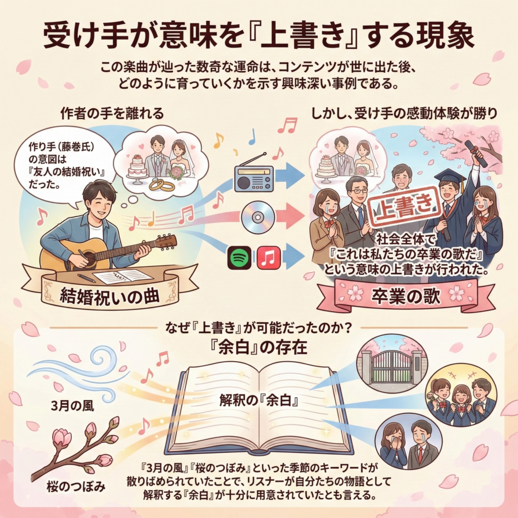 - 作り手(藤巻氏)の意図は「友人の結婚祝い」だった。しかし、受け手(視聴者・卒業生)の感動体験が勝り、社会全体で「これは私たちの卒業の歌だ」という意味の上書きが行われた。