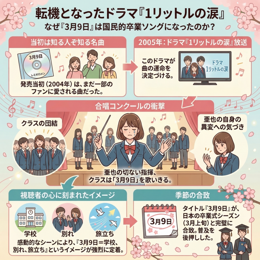 切ない展開の中でも、亜也は指揮を務め、クラスは『3月9日』を歌いきり、合唱コンクールは成功を収めた。 - この感動的なシーンが視聴者の心に深く刻まれ、「3月9日=学校、別れ、旅立ち」というイメージが強烈に定着することとなった。