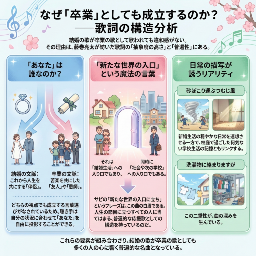 - それは「結婚生活」への入り口でもあり、同時に「社会や次の学校」への入り口でもある。人生の節目に立つすべての人に当てはまる、普遍的な応援歌としての構造を持っているのだ。