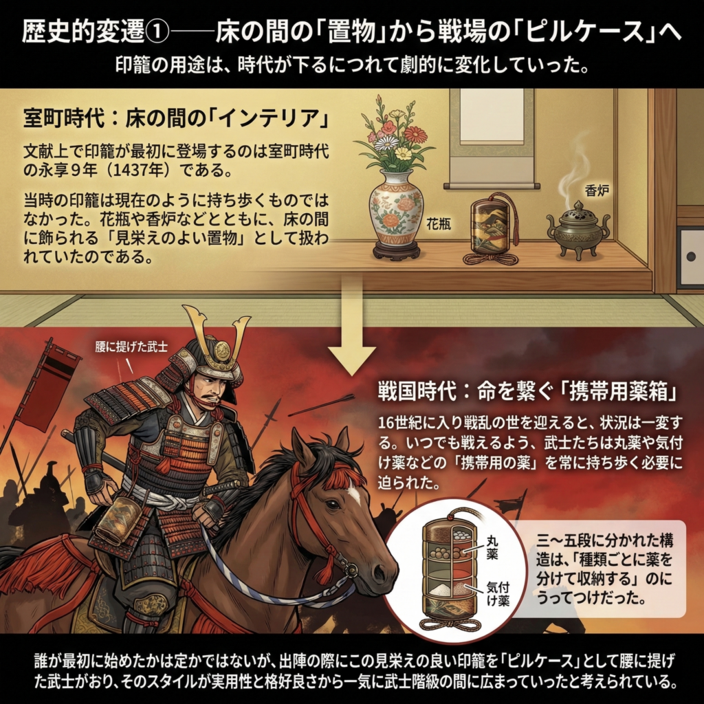 - 誰が最初に始めたかは定かではないが、出陣の際にこの見栄えの良い印籠を「ピルケース」として腰に提げた武士がおり、そのスタイルが実用性と格好良さから一気に武士階級の間に広まっていったと考えられている。