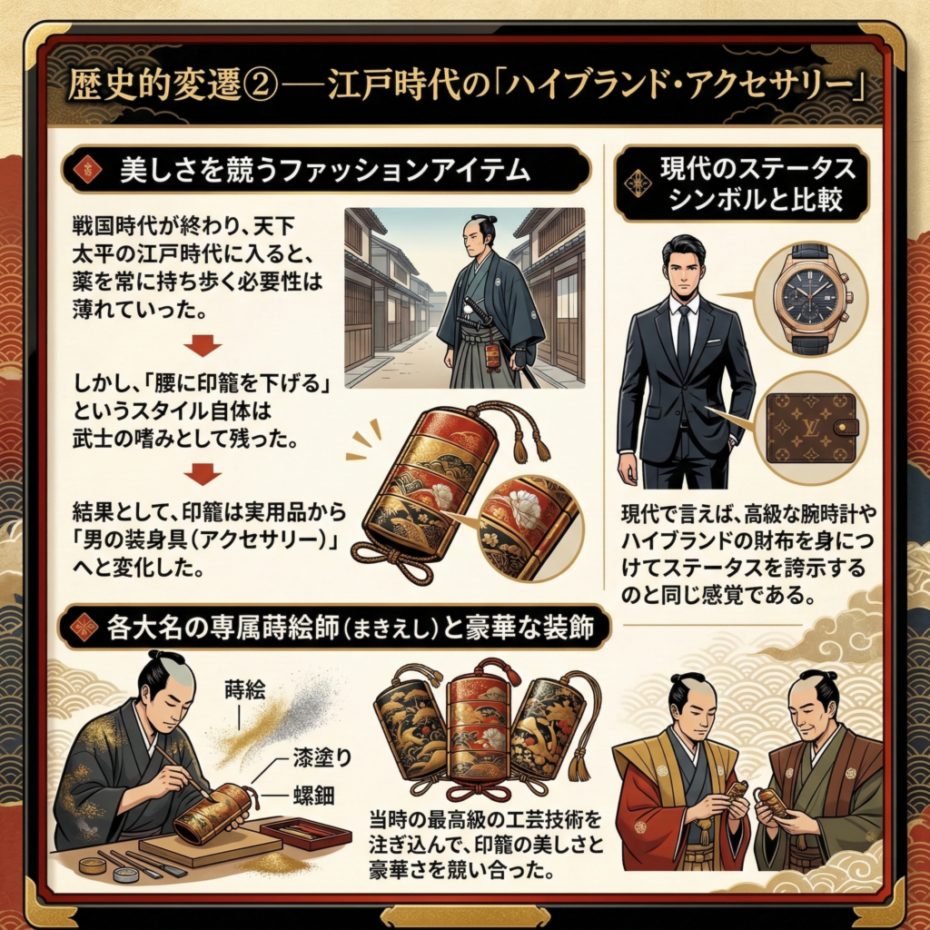 - 結果として、印籠は実用品から「男の装身具(アクセサリー)」へと変化した。