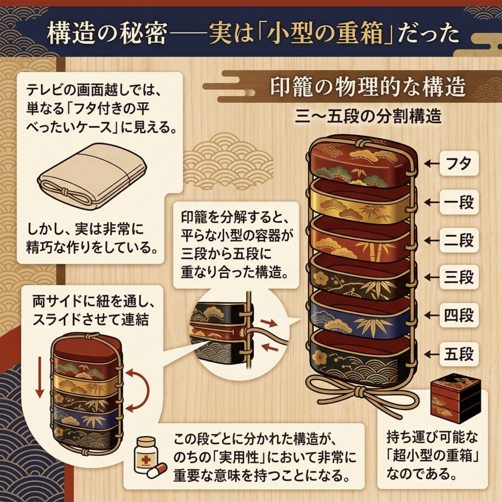 - そこで目をつけられたのが、床の間に飾られていた印籠である。三〜五段に分かれた構造は、「種類ごとに薬を分けて収納する」のにうってつけだった。