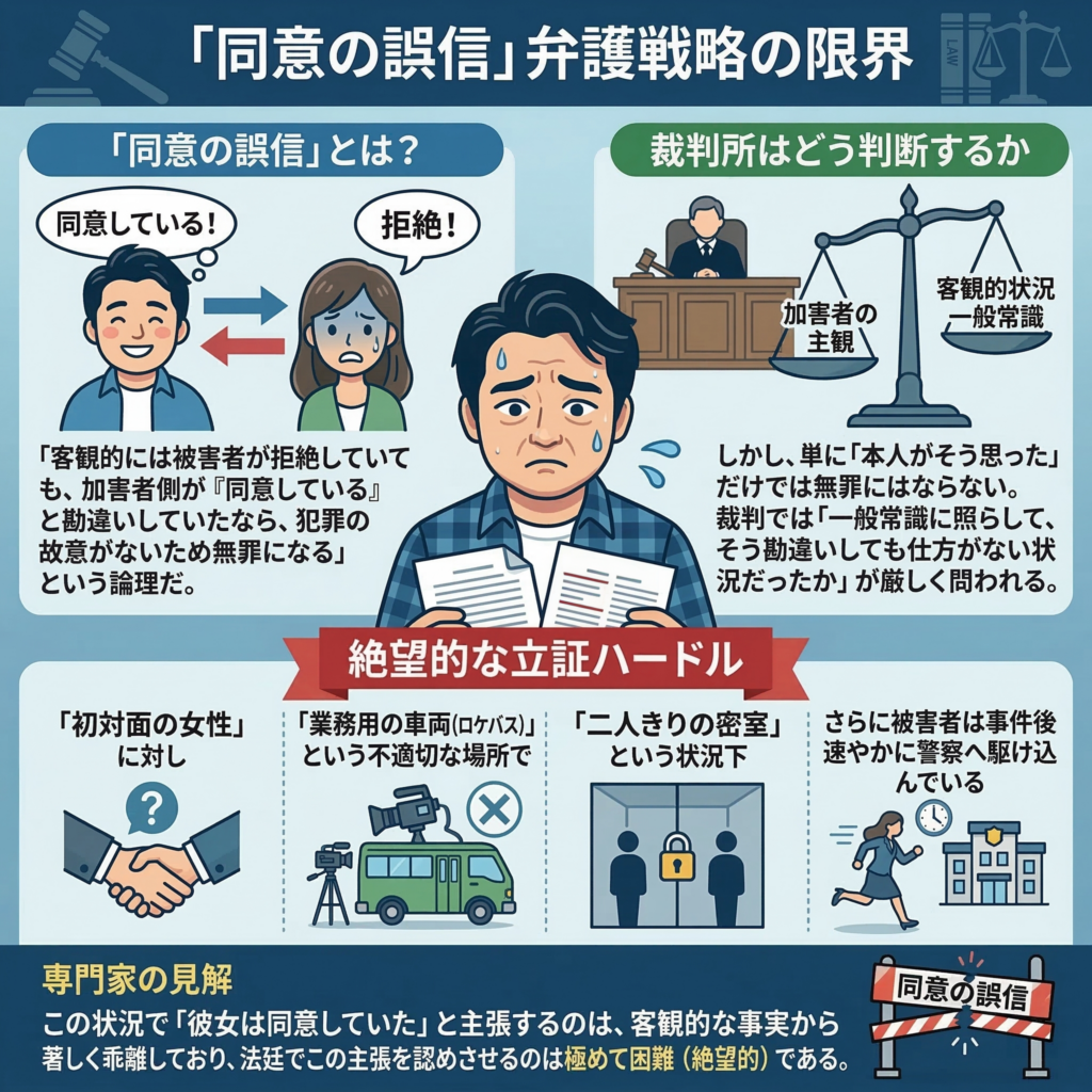 弁護側が主張しているのは、法律用語で「同意の誤信」と呼ばれるものである。