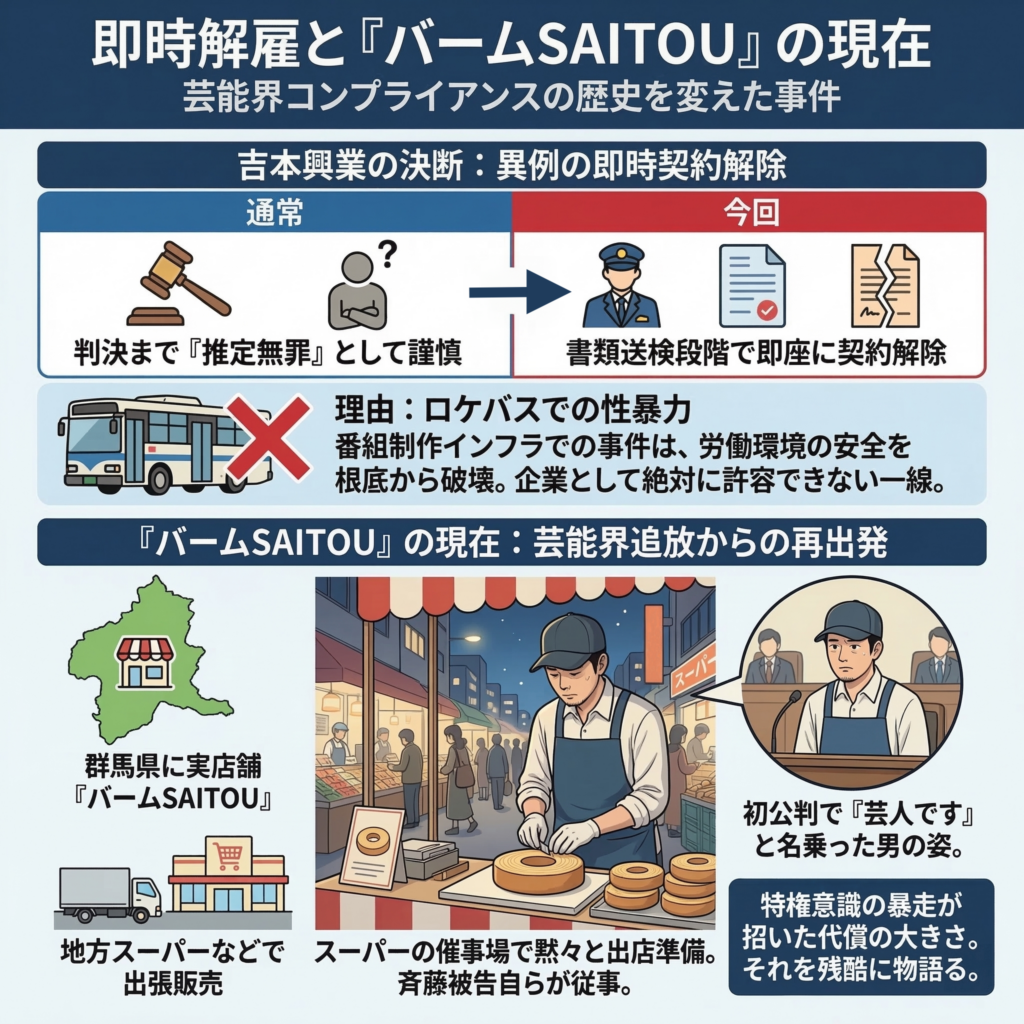 - 芸能界を事実上追放された斉藤被告は現在、群馬県に実店舗を置き、地方のスーパーなどで出張販売を行うバームクーヘン店「バームSAITOU」に自ら従事している。