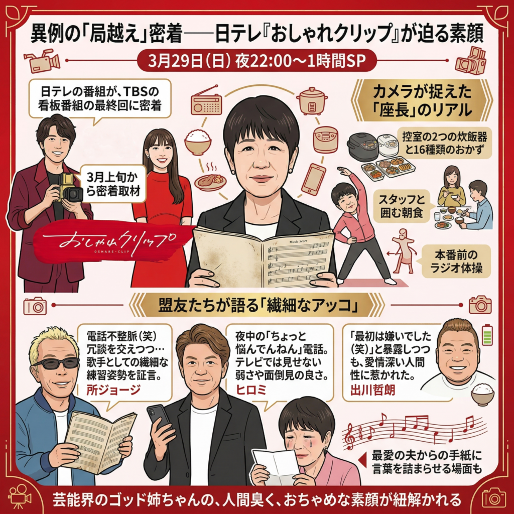 そして同日の夜22時からは、日本テレビ系『おしゃれクリップ』の1時間スペシャルが放送される。特筆すべきは、「日テレの番組が、TBSの看板番組の最終回に密着する」という、テレビ界の垣根を越えた異例の試みである。