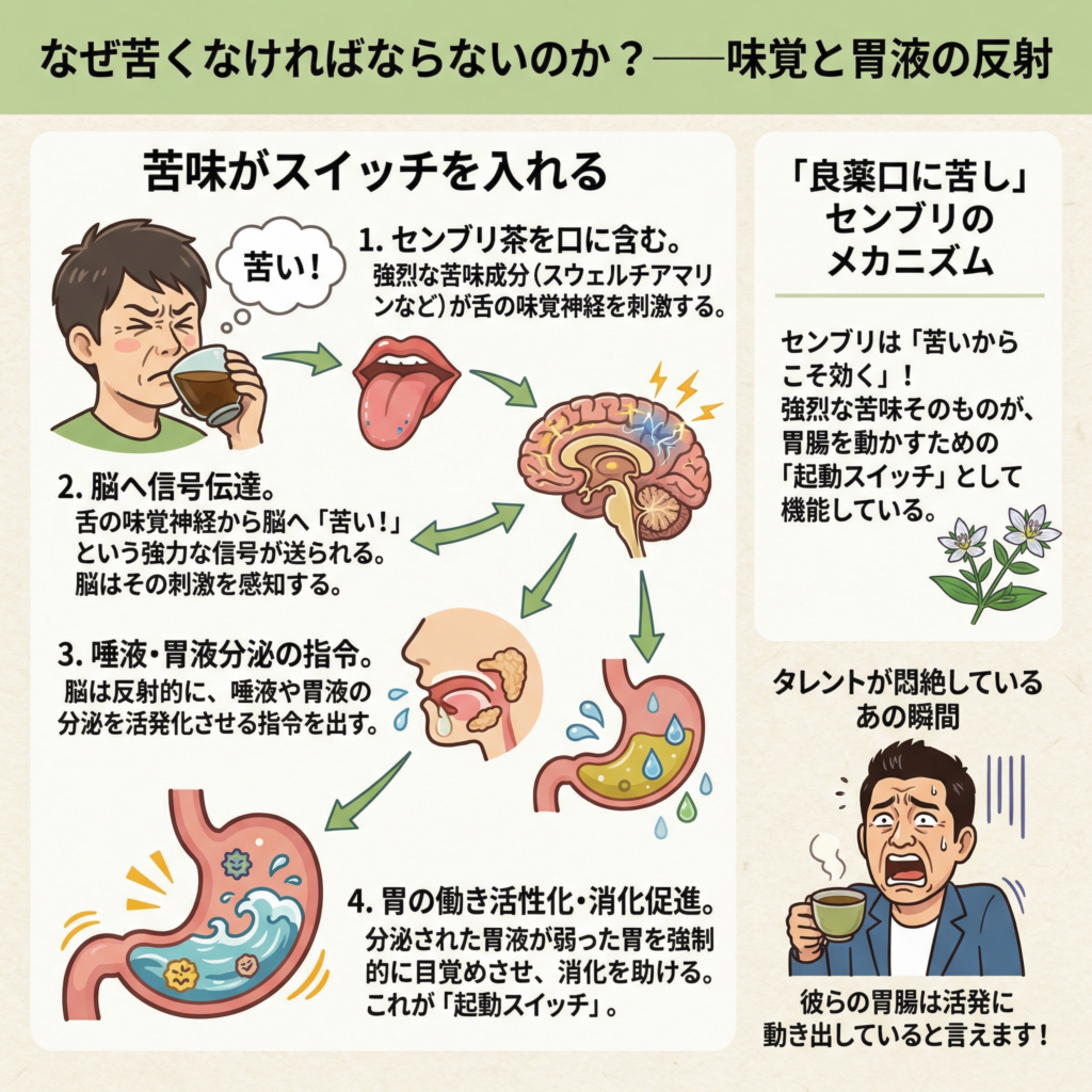 - つまり、あの顔が歪むほどの苦味そのものが、弱った胃の働きを強制的に目覚めさせ、消化を助けるための「起動スイッチ」として機能しているのである。タレントが悶絶しているあの瞬間、彼らの胃腸は活発に動き出していると言える。