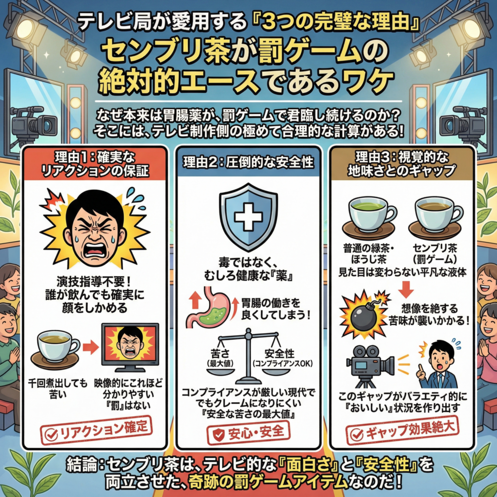 では、なぜ本来は胃腸薬であるセンブリ茶が、罰ゲームの絶対的エースとして君臨し続けているのか。そこには、テレビ制作側の極めて合理的な計算がある。