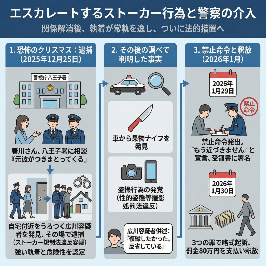 - 同署が春川さんを自宅へ送り届けた際、付近をうろついていた広川容疑者を発見。警察は強い執着と危険性を認定し、その場でストーカー規制法違反容疑で逮捕した。
