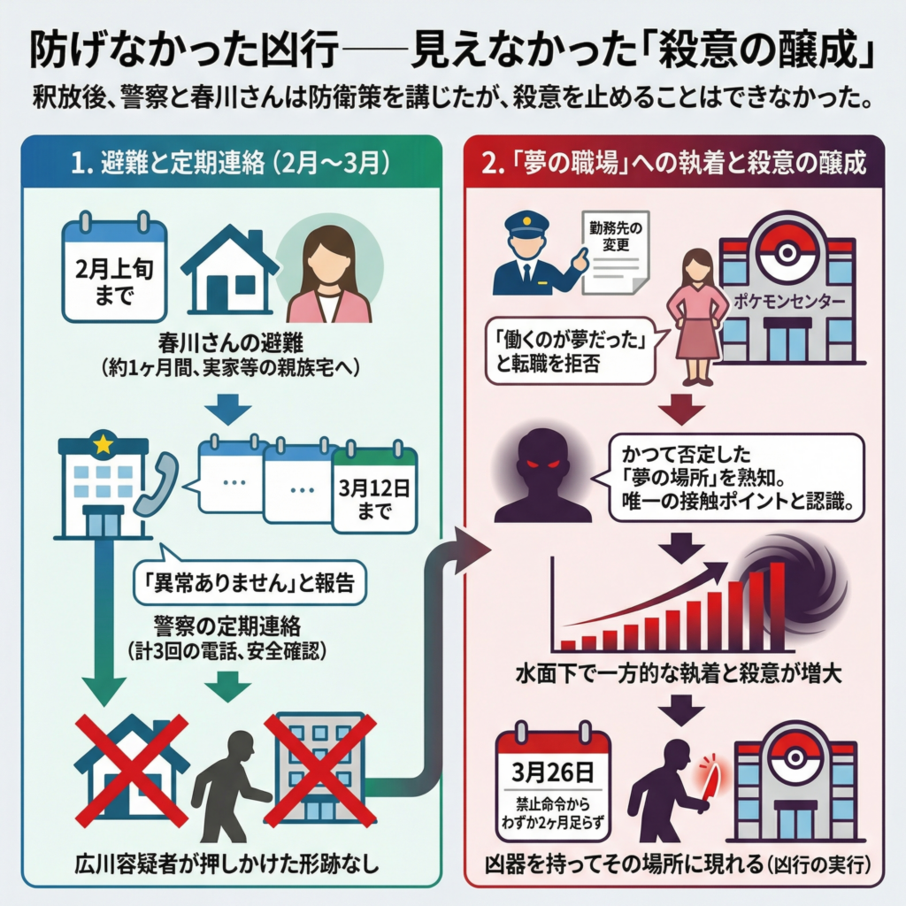 - 広川容疑者は、かつて自分が否定した彼女の「夢の場所」を熟知しており、そこが唯一、彼女と接触できる確実なポイントであることを知っていた。水面下で一方的な執着と殺意を募らせた彼は、禁止命令からわずか2ヶ月足らずの3月26日、凶器を持ってその場所に現れたのである。