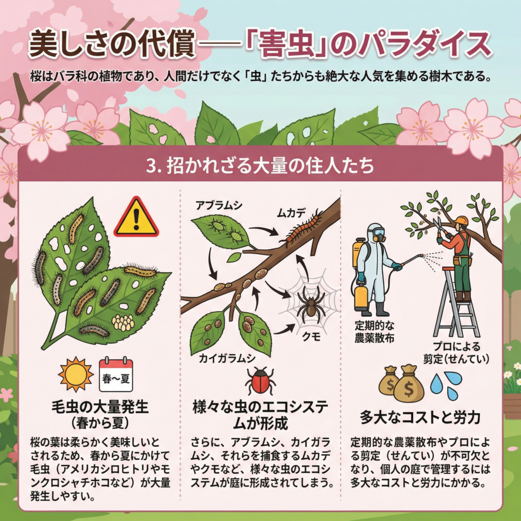 - 桜の葉は柔らかく美味しいとされるため、春から夏にかけて毛虫(アメリカシロヒトリやモンクロシャチホコなど)が大量発生しやすい。