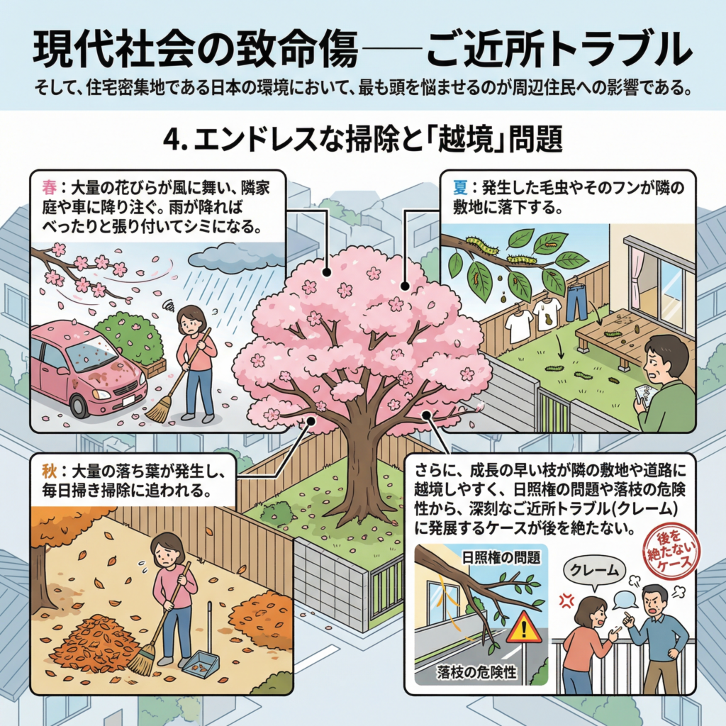 - 春: 大量の花びらが風に舞い、隣家の庭や車に降り注ぐ。雨が降ればべったりと張り付いてシミになる。