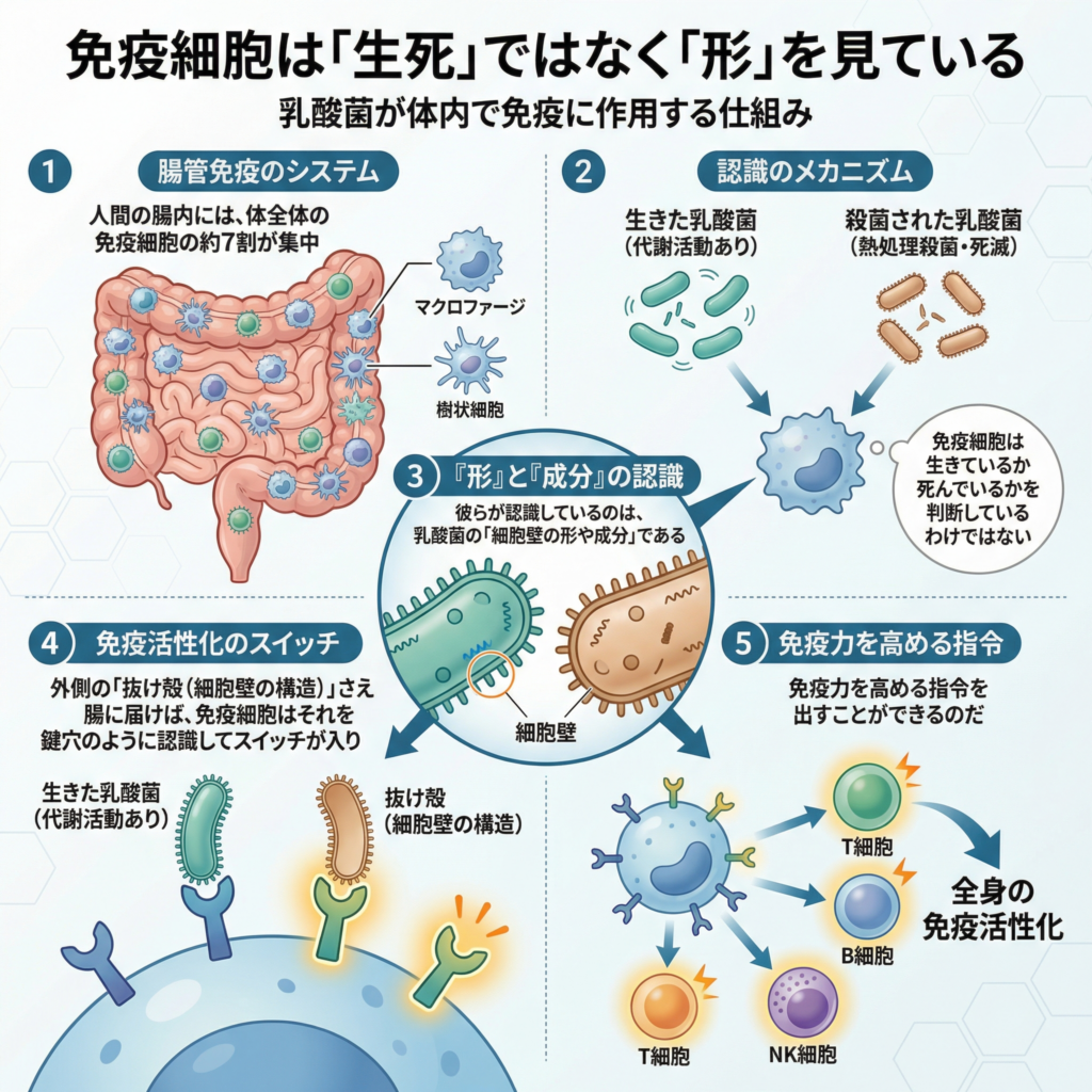 - つまり、熱処理などで殺菌されて中身が死んでいても、外側の「抜け殻(細胞壁の構造)」さえ腸に届けば、免疫細胞はそれを鍵穴のように認識してスイッチが入り、免疫力を高める指令を出すことができるのだ。