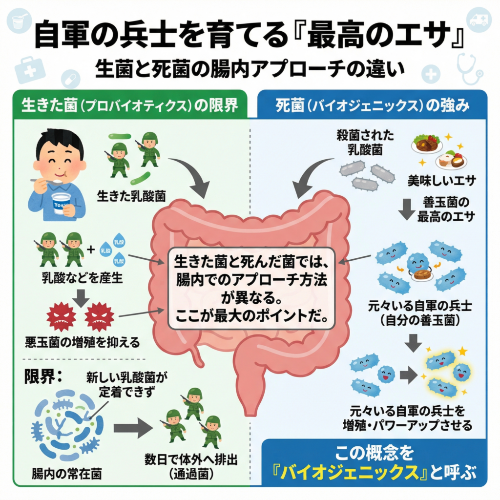 生きた菌と死んだ菌では、腸内でのアプローチ方法が異なる。ここが最大のポイントだ。