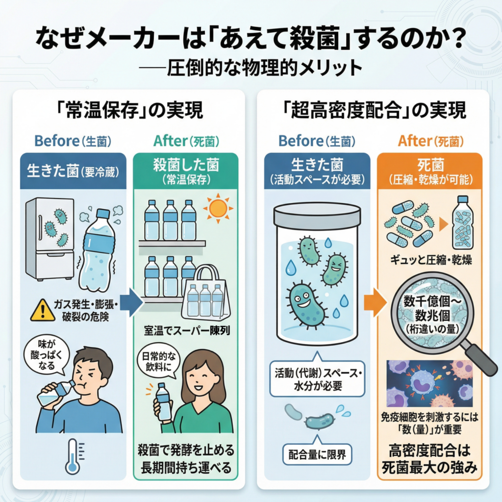 食品メーカーが乳酸菌をあえて殺菌する背景には、製造および流通における極めて合理的な理由が存在する。