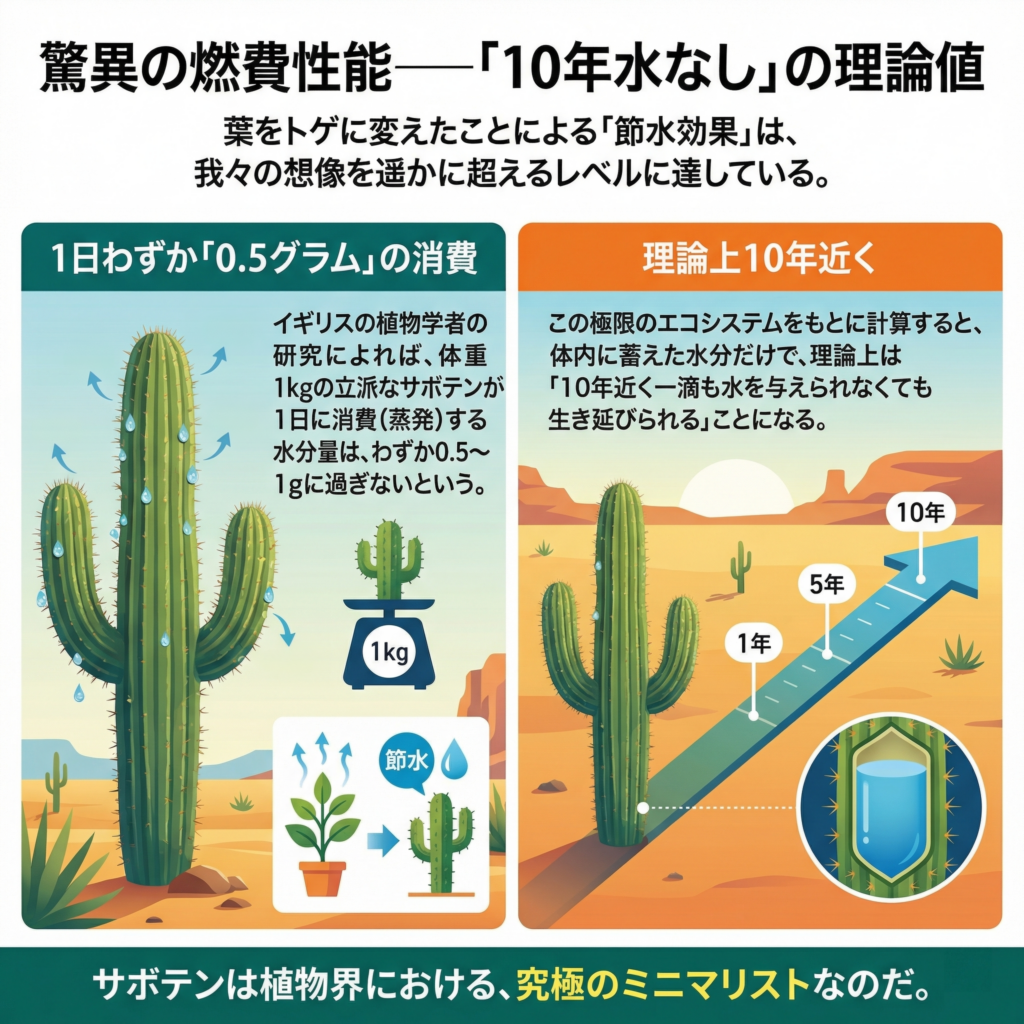 - イギリスの植物学者の研究によれば、体重1kgの立派なサボテンが1日に消費(蒸発)する水分量は、わずか0.5〜1gに過ぎないという。