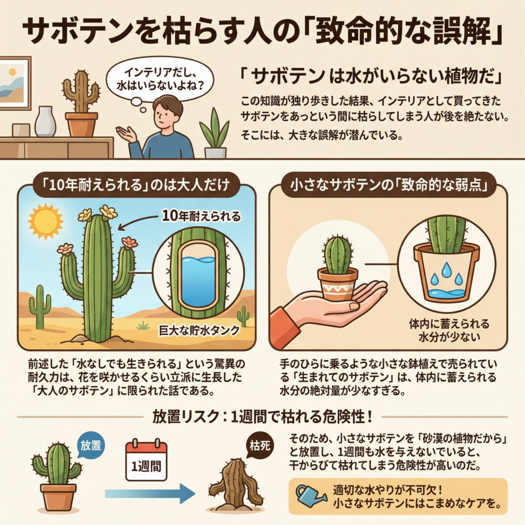 - 手のひらに乗るような小さな鉢植えで売られている「生まれたてのサボテン」は、体内に蓄えられる水分の絶対量が少なすぎる。