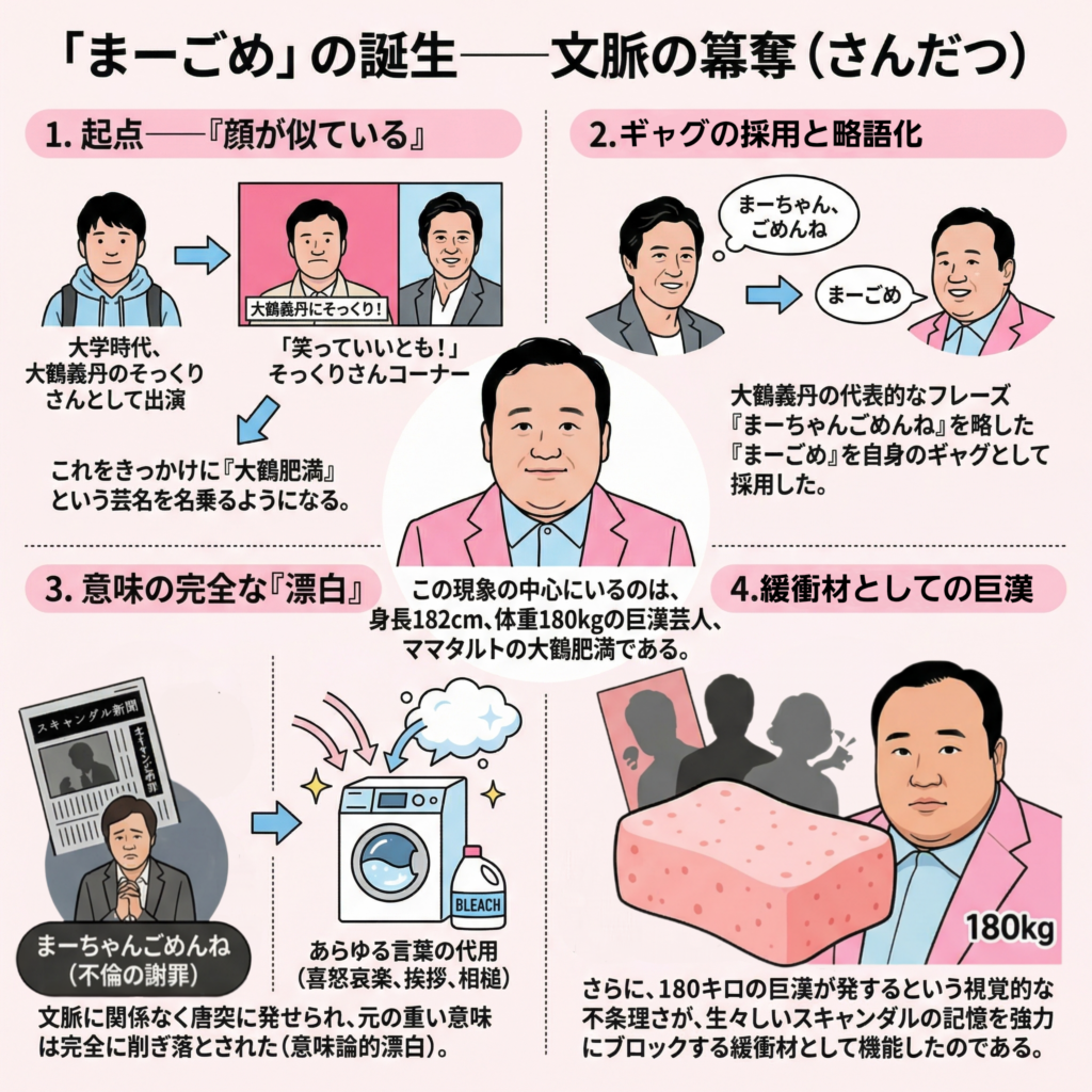 • 彼の発明は、この言葉を「あらゆる言葉の代用」として使ったことだ。喜怒哀楽、挨拶、相槌など、文脈に関係なく唐突に「まーごめ」と発せられることで、元の「不倫の謝罪」という重い意味は完全に削ぎ落とされた(意味論的漂白)。