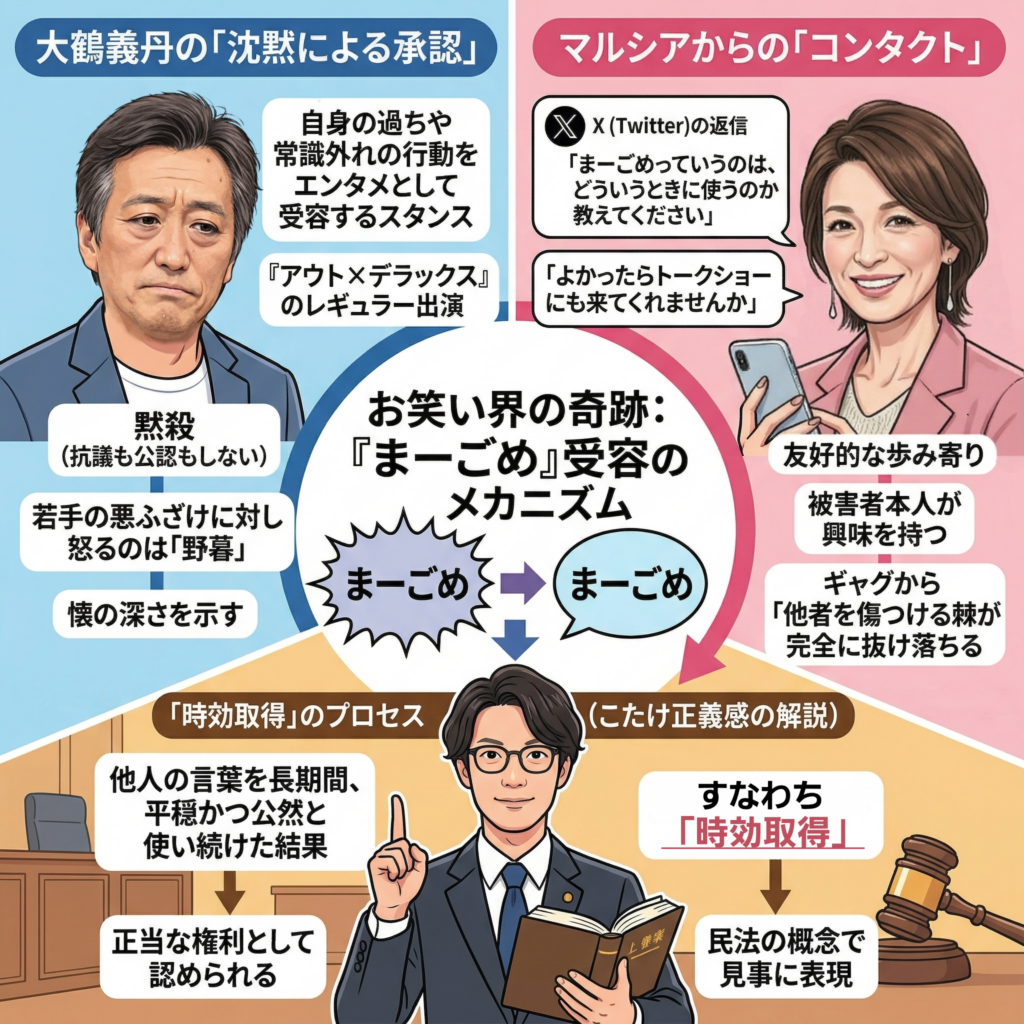 • 芸人のこたけ正義感(弁護士)は、他人の言葉を長期間、平穏かつ公然と使い続けた結果、正当な権利として認められるこのプロセスを、民法の「時効取得」という言葉で見事に表現している。