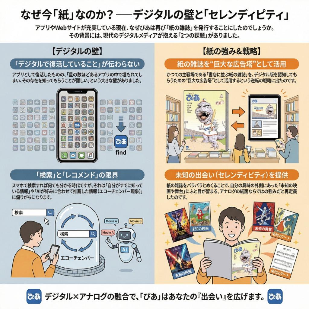 アプリやWebサイトが充実している現在、なぜぴあは再び「紙の雑誌」を発行することにしたのだろうか。その背景には、現代のデジタルメディアが抱える「2つの課題」があった。