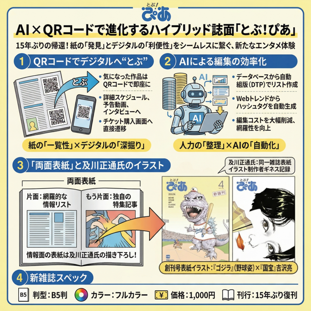 15年ぶりに創刊された『とぶ!ぴあ』(B5判・フルカラー・価格1,000円)は、ただ昔の姿に戻ったわけではありません。最新のテクノロジーを駆使した「紙とデジタルのハイブリッド」として進化している。