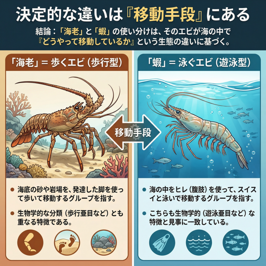 結論から言えば、「海老」と「蝦」の使い分けは、そのエビが海の中で「どうやって移動しているか」という生態の違いに基づいている。