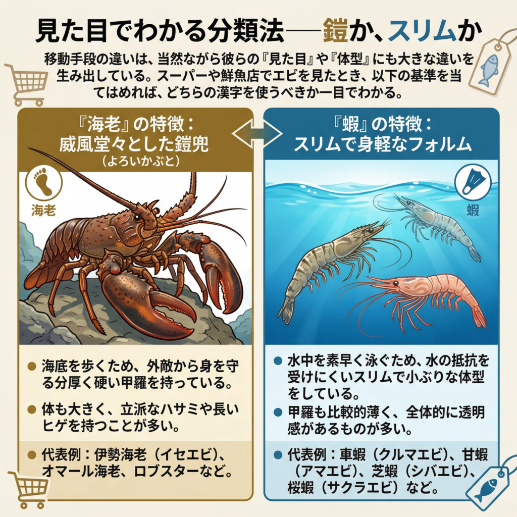 移動手段の違いは、当然ながら彼らの「見た目」や「体型」にも大きな違いを生み出している。スーパーや鮮魚店でエビを見たとき、以下の基準を当てはめれば、どちらの漢字を使うべきか一目でわかる。