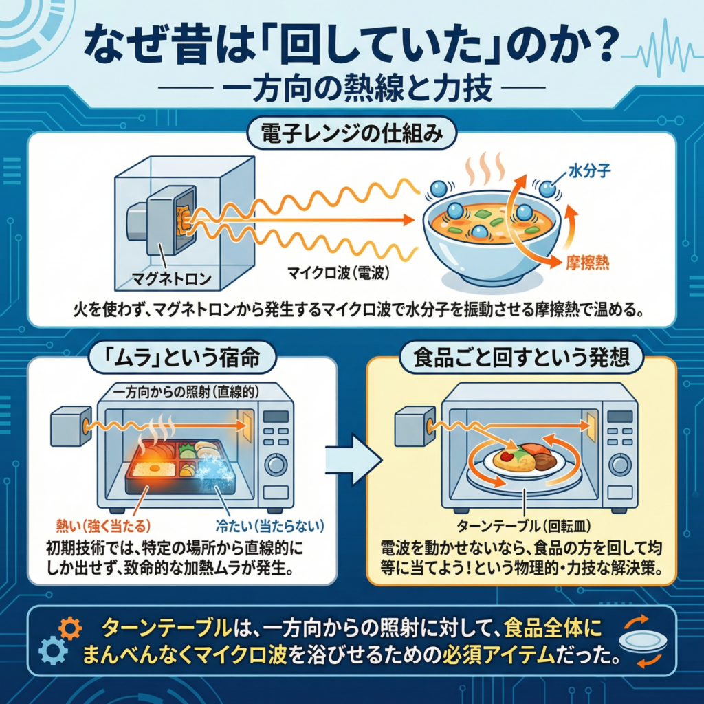 なぜ、電子レンジは回らなくなったのか。あるいは、なぜ昔は回さなければならなかったのか。