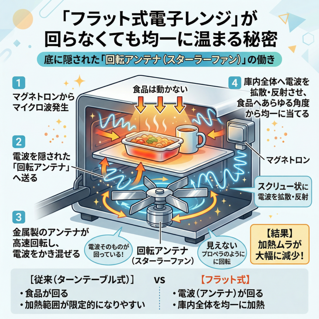• フラット式の庫内の底面(真っ平らな床の下)には、金属製の「回転アンテナ(スターラーファンなど)」と呼ばれる部品が隠されている。