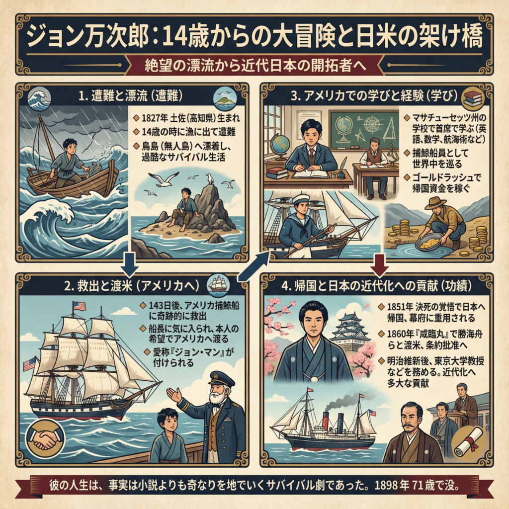 ジョン万次郎(本名:中浜万次郎)は、幕末から明治にかけて活躍した通訳・翻訳家であり、日米の歴史を動かした重要人物の一人である。彼の人生は、事実は小説よりも奇なりを地でいくサバイバル劇であった。