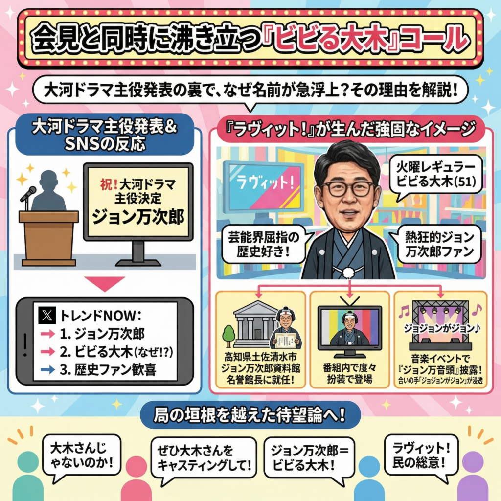 大河ドラマの主役としてこれ以上ないほどドラマチックな人物の選定に、歴史ファンからは期待の声が上がった。しかし、SNS(X)のトレンドには「ジョン万次郎」とともに、なぜか「ビビる大木」という名前が急浮上した。