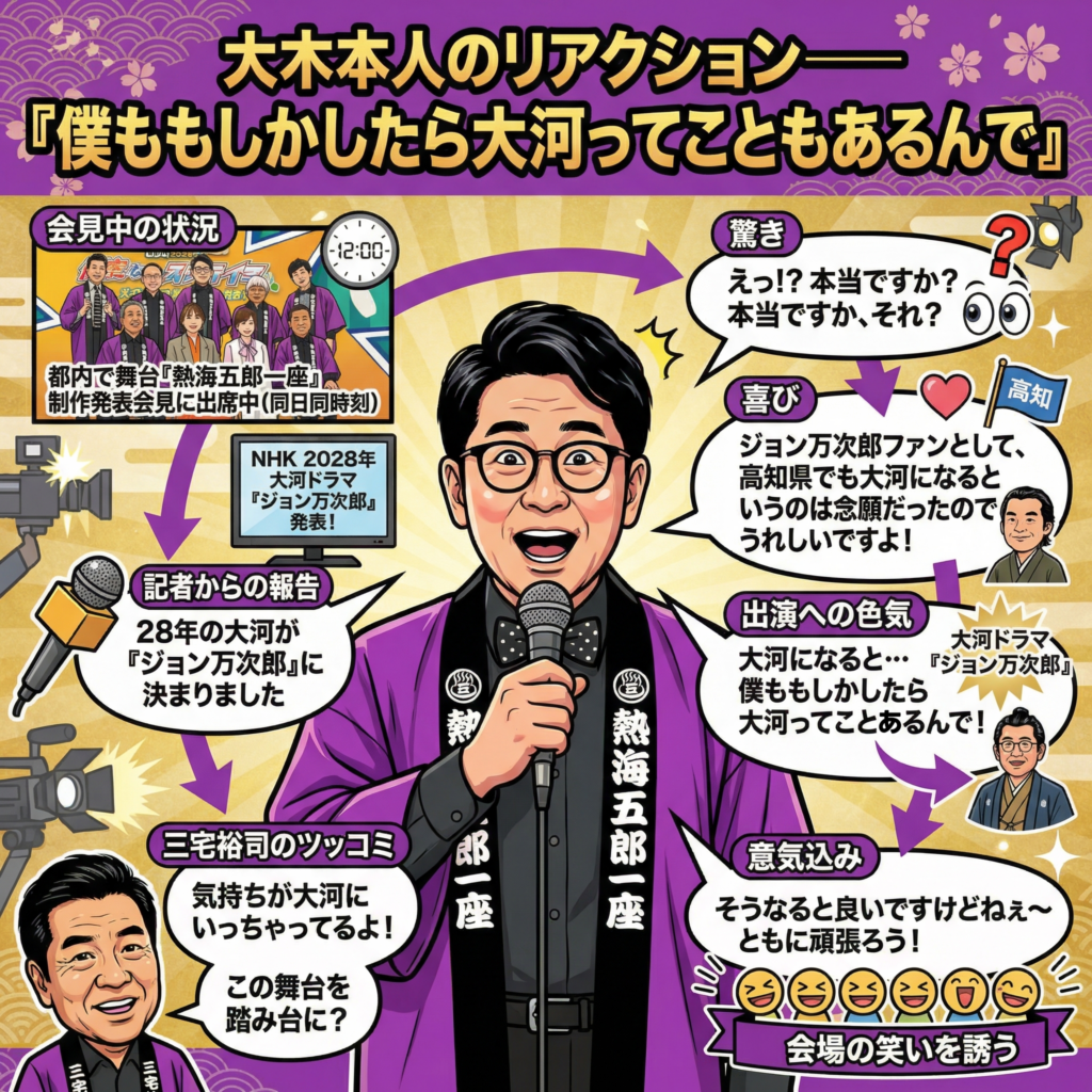 - 記者から「28年の大河が『ジョン万』に決まりました」と知らされた大木は、「本当ですか? 本当ですか、それ?」と驚きの表情を見せた。