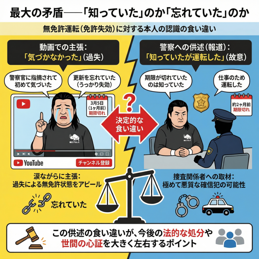 信号無視という過失以上に、今回の事件で重大な問題となっているのが「無免許運転(免許失効)」に対する本人の認識である。ここにおいて、警察への供述とYouTubeでの釈明に決定的な食い違いが生じている。