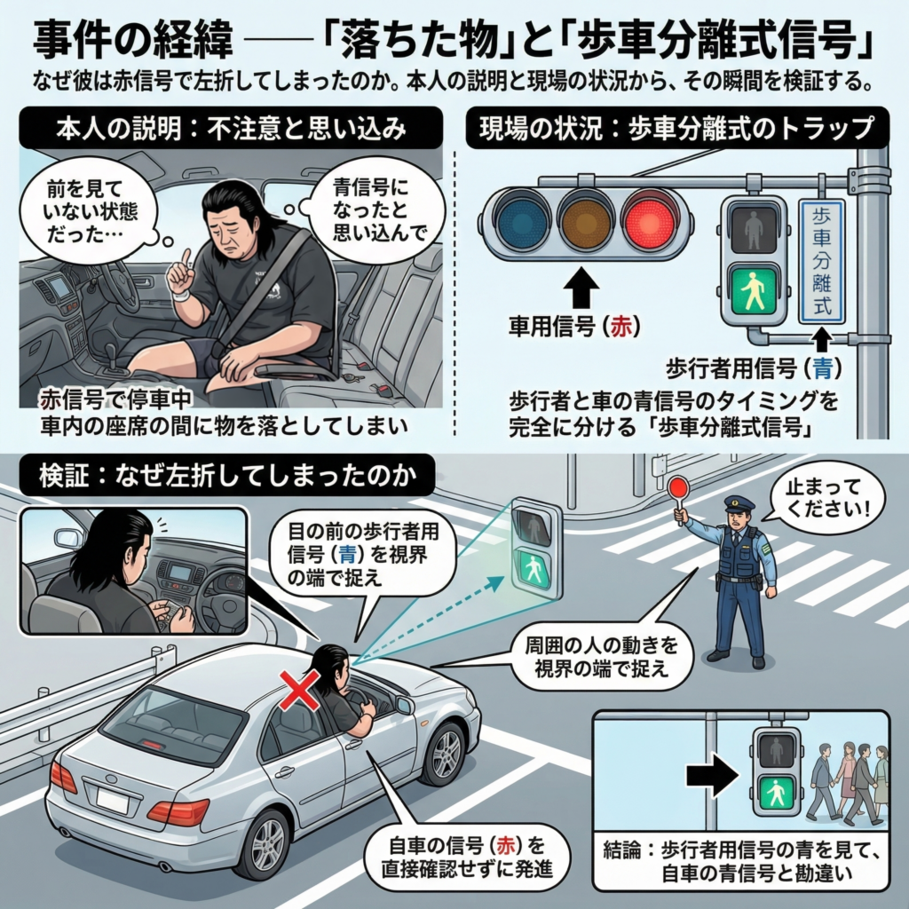 なぜ彼は赤信号で左折してしまったのか。本人の説明と現場の状況から、その瞬間を検証する。