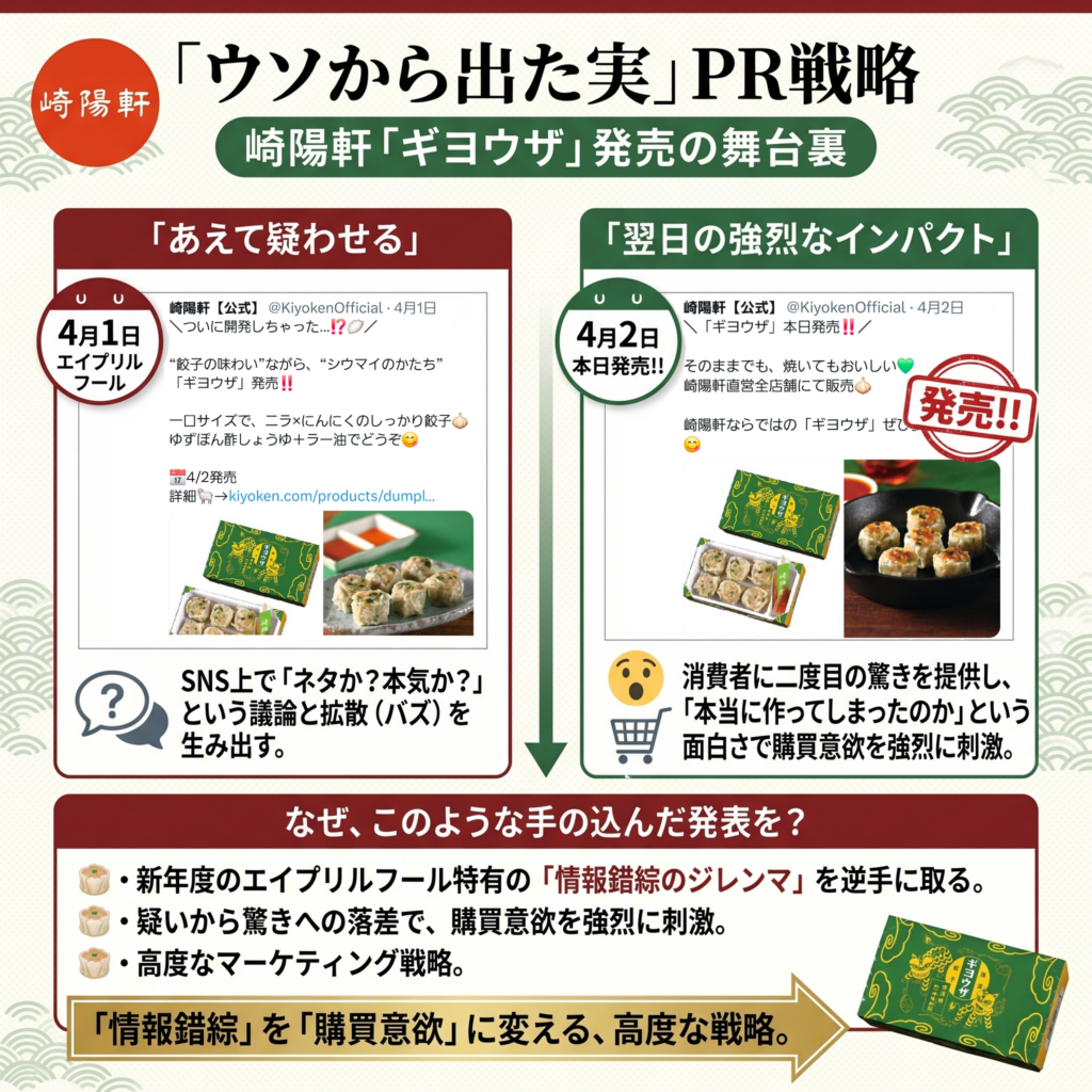 なぜ崎陽軒は、このような手の込んだ発表を行ったのか。それは、新年度の始まりと重なる日本のエイプリルフール特有の「情報錯綜のジレンマ」を逆手に取った、極めて高度なマーケティング戦略である。
