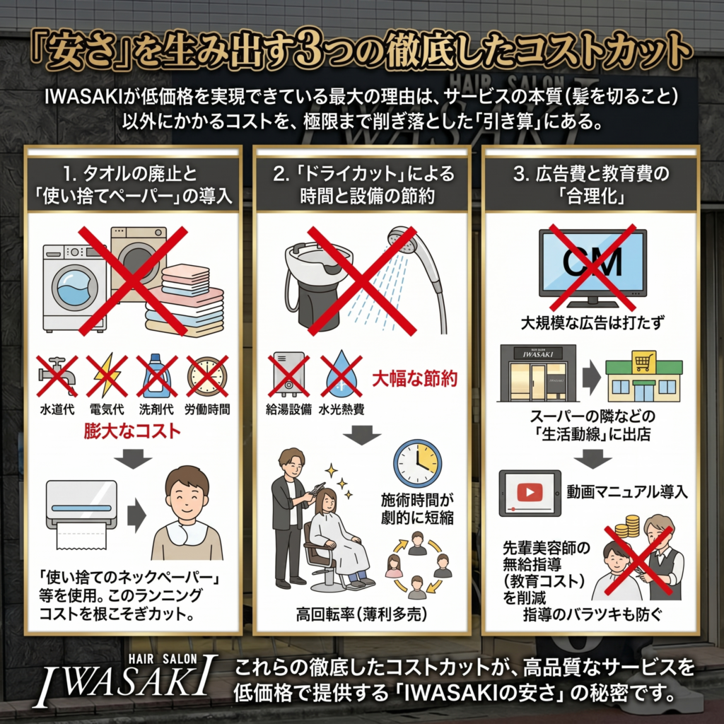 IWASAKIが低価格を実現できている最大の理由は、サービスの本質(髪を切ること)以外にかかるコストを、極限まで削ぎ落とした「引き算」にある。